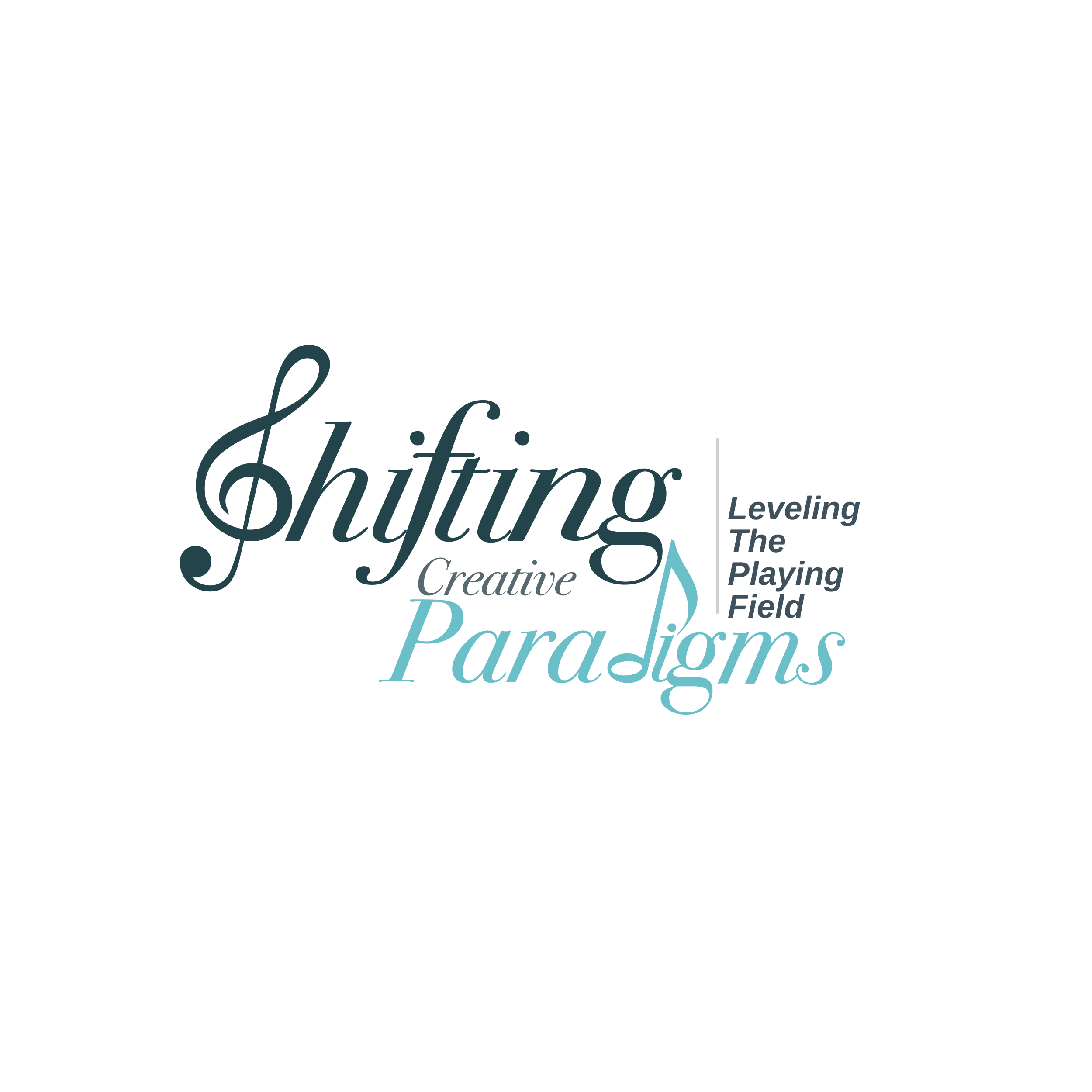 A dark grey, light grey, and light blue logo featuring a music note for the “S” and “D” in the text: Shifting Creative Paradigms - Leveling the Playing Field logo.